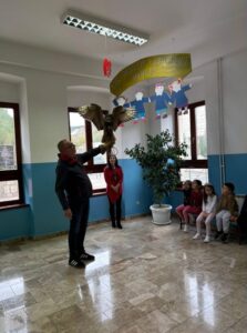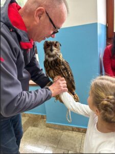 Po povratku nas je u predvorju škole dočekalo pravo iznenađenje: sokolar gospodin Grgo Nikolić pokazao nam je Huga, pravu sovu te nam ispričao nam puno zanimljivosti o sovama ušarama.